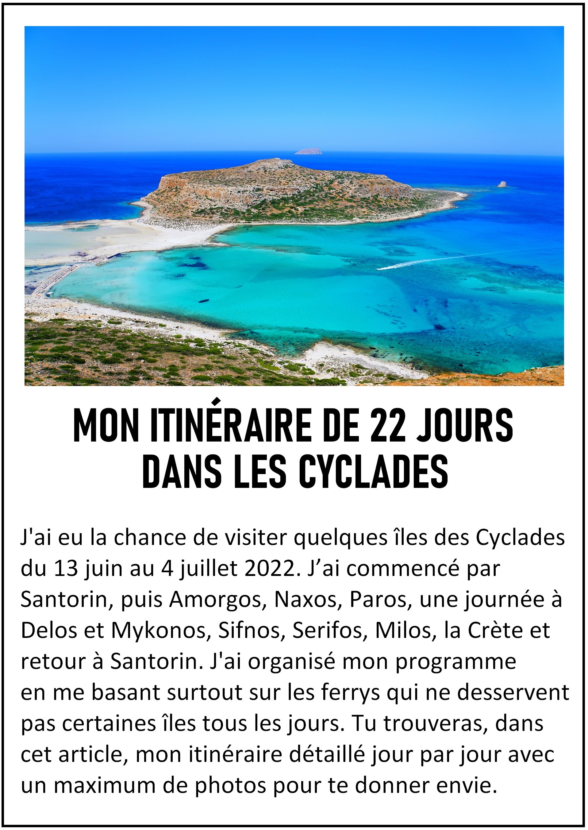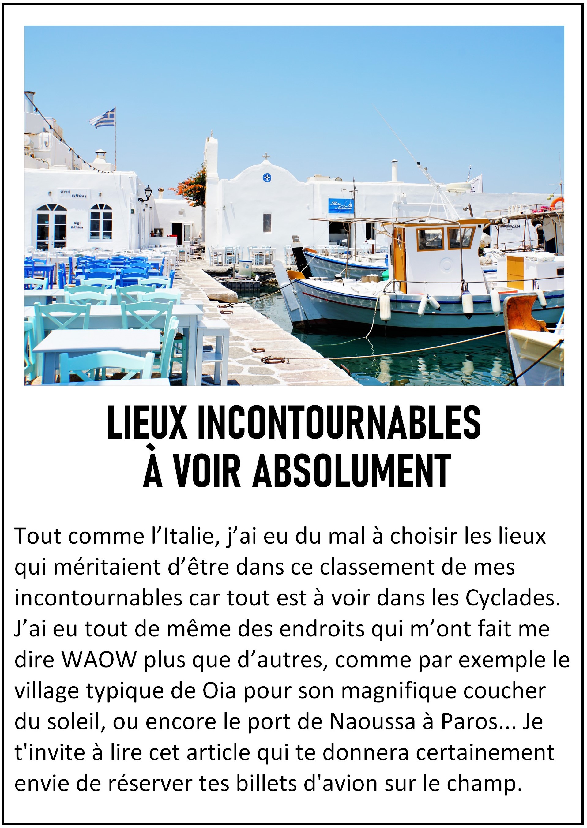 Quand on parle des Cyclades, on pense tout de suite à Santorin et son merveilleux coucher de soleil. Mais les Cyclades c’est aussi des bougainvilliers en fleurs à chaque coin de rue, des chants grecs, une cuisine à en faire frémir tes papilles, une eau transparente, des moulins à n’en plus finir, des toits bleus et des paysages saisissants. Laisse moi te faire découvrir quelques îles de la mer Égée dans cet article, qui va, j’en suis sûre, te donner envie de réserver tes billets d’avion immédiatement !