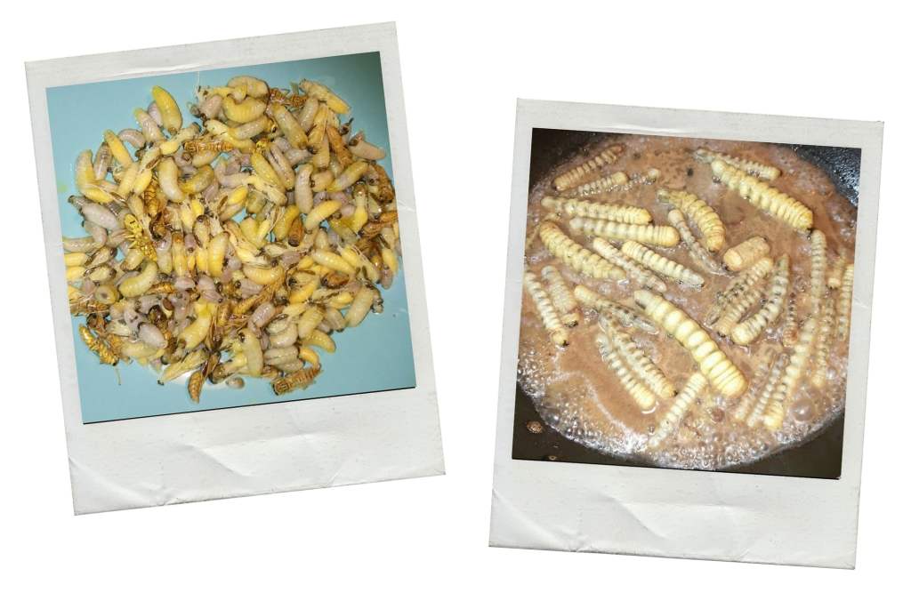 Mais j’ai pu surtout découvrir et manger des choses que je n’aurais mangé nul part ailleurs ! Par exemple, les américains bouchons gratinés (meilleur sandwich qui existe au monde) qui n’ont absolument rien à voir avec nos américains à nous. Ils sont composés d’une demi baguette, de la viande que l’on souhaite (les bouchons sont l’accompagnement qu’il faut à tout prix choisir !), de sauces (mayo, ketchup, harissa, samouraï …), de frites et par dessus de gruyère qui fond à la cuisson. C’est juste merveilleux gustativement parlant ! Puis, plus loufoque, il y a aussi les larves de guêpes et les zendettes ! Les créoles raffolent de ces bébêtes qui sont pourtant vendues extrêmement cher ou qui sont difficilement accessible. En effet, pour les larves de guêpes (à gauche ci-dessous), il suffit de chopper un nid en faisant fuir les guêpes et en extrayant ensuite les larves avec une pince à épiler. Il faut ensuite les faire frire à la poêle avec un peu de sel et le tour est joué ! Quant aux zendettes (à droite ci-dessous), il s’agit de larves de la famille des longicornes. Elles vivent principalement dans le bois pourri. La consommation des zendettes est une tradition ancestrale à la Réunion car, dans le temps, c’étais un moyen de subsistance pour les esclaves se réfugiant dans les hauts de l’île. Ces larves se trouvent en effet dans les tamarins des hauts mais aujourd’hui, il est interdit de les ramasser sous peine d’amende. Les zendettes comme les larves de guêpes peuvent se manger crues mais c’est quand même bien meilleur quand c’est frit !