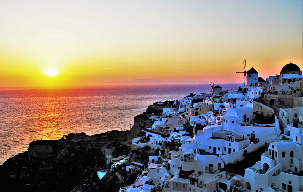 Mais ce qui vaut à Oia la première place du classement de mes incontournables c’est sans aucun doute son coucher du soleil ! Un des plus beaux de ma vie jusqu’à présent. Et il se mérite ! Pour le contempler au meilleur endroit, il faut te rendre aux ruines du château Bizantin, tout au bout du village, et ce, au moins 2h à l’avance tellement qu’il y a du monde pour le contempler ! J’y étais vers 18h alors que le soleil se couchait à 20h40 et il y avait déjà quelques personnes qui attendaient. Je me suis positionnée sur le muret en pierres avec une vue exceptionnelle sur les moulins en face et je n’ai plus bougé ! Une heure après, il y avait une foule de dingue. Le spectacle en valait carrément la peine et les couleurs, qui changeaient au fil des minutes, étaient incroyables !