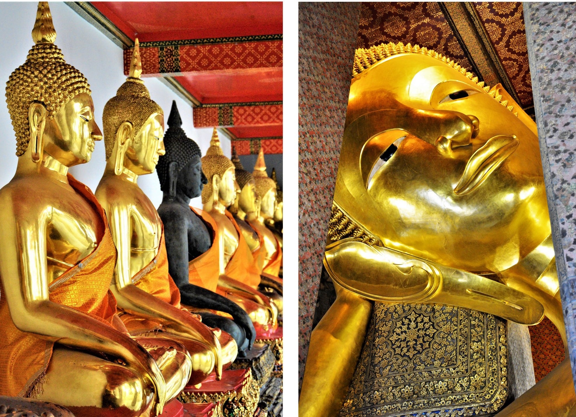 Accessible très facilement à pied du centre ville, le site est ouvert de 8h30 à 15h30 tous les jours mais rien ne sert de t’y pointer bien à l’avance, comme j’ai fait, en te disant que tu vas être dans les premiers pour éviter la foule. J’ai tourné 20 bonnes minutes autour avant de rencontrer une brésilienne qui cherchait également l’entrée. On s’est aperçues bien après qu’en réalité, l’entrée se fait par une file d’attente hypeeeer longue où tu dois passer entre des portiques de sécurité et tout le tralala à quelques centaines de mètres du Grand Palais. On a attendu quand même pas mal de temps avant d’accéder au guichet où, bien entendu, les gardes trouveront toujours un moyen de te refouler en disant que ta tenue n’est pas correcte pour te faire acheter des vêtements. Alors pour ne pas avoir de soucis, il faut porter un pantalon, un tee-shirt qui te couvre les épaules comme il faut (pas d’écharpe ou d’étoffe, ça ne marche pas) et des sandales ou chaussures fermées mais pas de tongs. Le ticket coûte l’équivalent de 10 euros (500 baths) et tu en as pour au moins 4h de visite si ce n’est plus tellement qu’il y a des choses à voir et du monde (crois moi que tu ne te rends vraiment pas compte du nombre de touristes par jour qui visitent le site !) Tu y verras, entre autre, le bouddha d’émeraude, l’énorme bouddha couché, le palais de l’ancien roi de Thaïlande, des jardins magnifiques, des décorations toutes fait main impressionnantes et j’en passe.